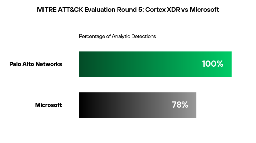 Microsoft Defender XDR n’offre pas la visibilité et les capacités de détection nécessaires pour défendre efficacement les entreprises contre les attaques perpétrées par des groupes étatiques. Les évaluations MITRE ATT&CK 2023 (Turla) ont mis les produits EDR à l’épreuve face à des implants réseau et des backdoors utilisées par les services de renseignement russes. Lors de ces tests, Microsoft a obtenu un taux de détection analytique de 78,3 %, là où Cortex XDR a atteint le score parfait de 100 %. En d’autres termes, les outils Microsoft ont été incapables de détecter 21,7 % des sous-étapes exécutées par les outils des attaquants, contrairement à Cortex XDR qui a fait un sans-faute.