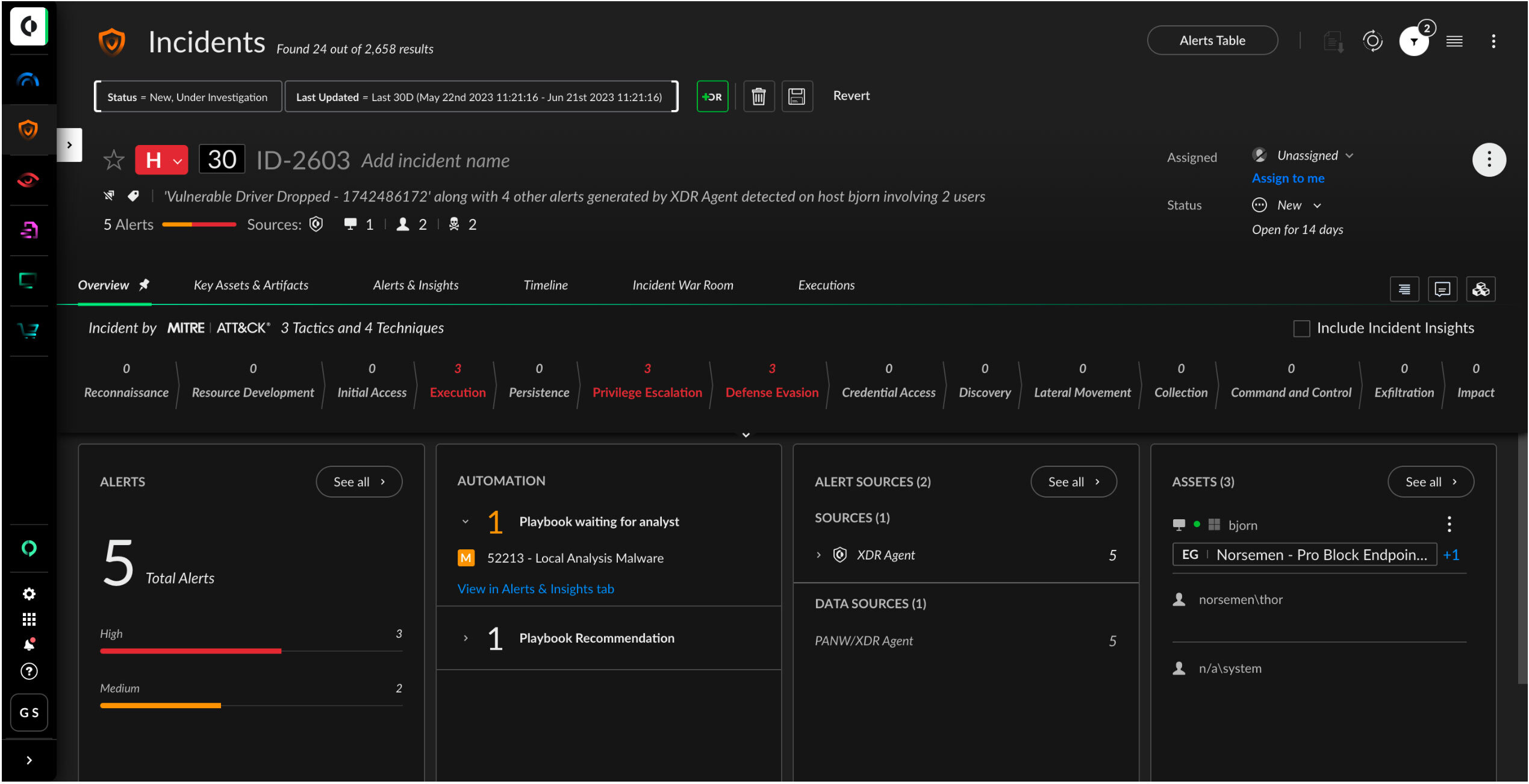 Cortex XSIAM propose une automatisation inédite du flux de gestion des incidents, véritable atout dans sa mission première de détection et de réponse aux menaces. Ses analyses produisent des données CTI basées sur les techniques des attaquants, regroupant ainsi différentes alertes au sein d’un même incident, en contexte et avec des données enrichies. L’automatisation intégrée et les playbooks inline prennent ensuite le relais pour agir sur la base des résultats d’analyse, avec pour objectif de traiter intégralement et de clore un maximum d’alertes et d’incidents sans intervention humaine.
